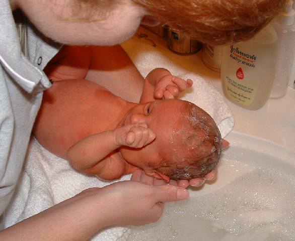 ![]() | Here, Kellie diligently washes Alexander's fine baby hair. It's brown instead of blond like we expected. (36K) |